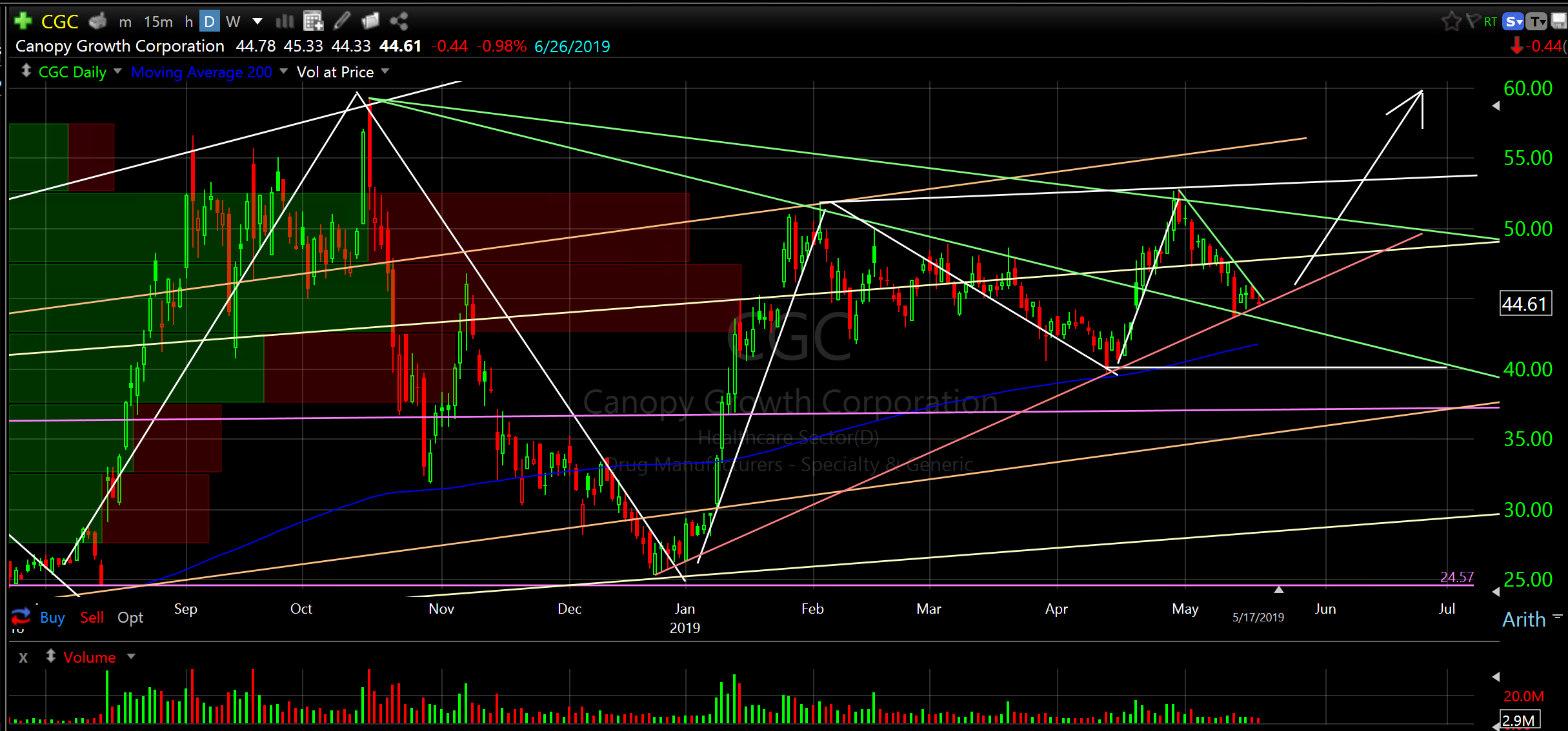 Canopy Growth Corporation (CGC)…Classic rotation from Basic Materials to Weed. Maybe Weed is a Basic Material…joke…sorry… couldn’t resist. But, who knows, you’ve got to own a little cannabis and a little crypto (GBTC) these days. In all seriousness CGC is also speculative. Corrected from 60 to 25 late last year, however, longer term rising support (lows). Price is currently squeezing into the corner of multiple wedges and if it doesn’t break below ascending bottom of wedge (pink line) and if it breaks up and through descending top of wedge (1st then 2nd green lines) it has a chance to expand to new highs. Monday should help tell the tale. If it gets a bid Monday I will send out an alert. Wait for my alert or cross of 1st green line.
