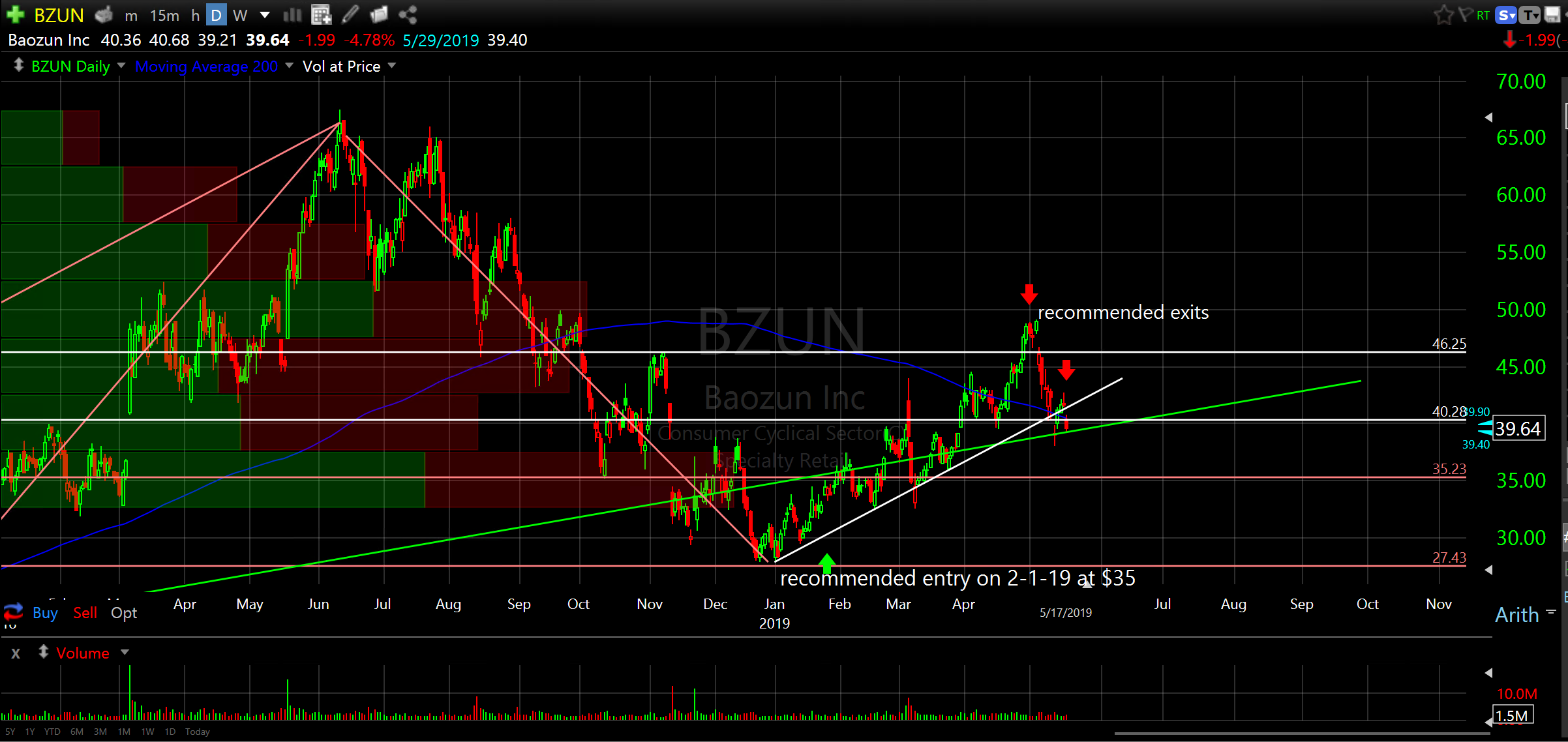 Baozun Inc (BZUN)… exit for a 13% gain. I recommended partial profits on May 6th for a gain of 31% as well. We can reenter later. I still love China. Remember, you can always hold a little. I’m not negative longer term on this but it looks like it wants to give back about 10% soon. Side rant…I don’t want to sell it either. I just want it to keep running. I don’t want to give back gains either. The dilemma continues…thus the charting.