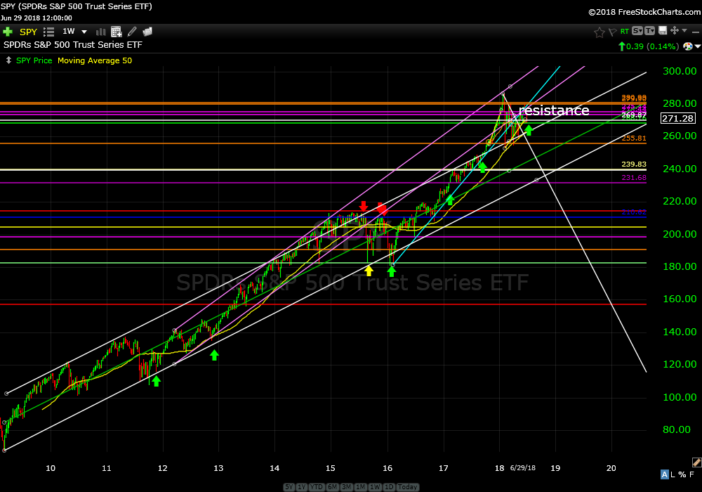 SPY has had three down weeks in a row but is still trading well above it’s rising channel from the bottom in 2009. Any time price trades above it’s long term rising channel it would be normal to correct back down and resume it’s uptrend inside the channel where price would be in a more sustainable uptrend. Investors need time to adjust to higher prices. See weekly chart from 2009.
