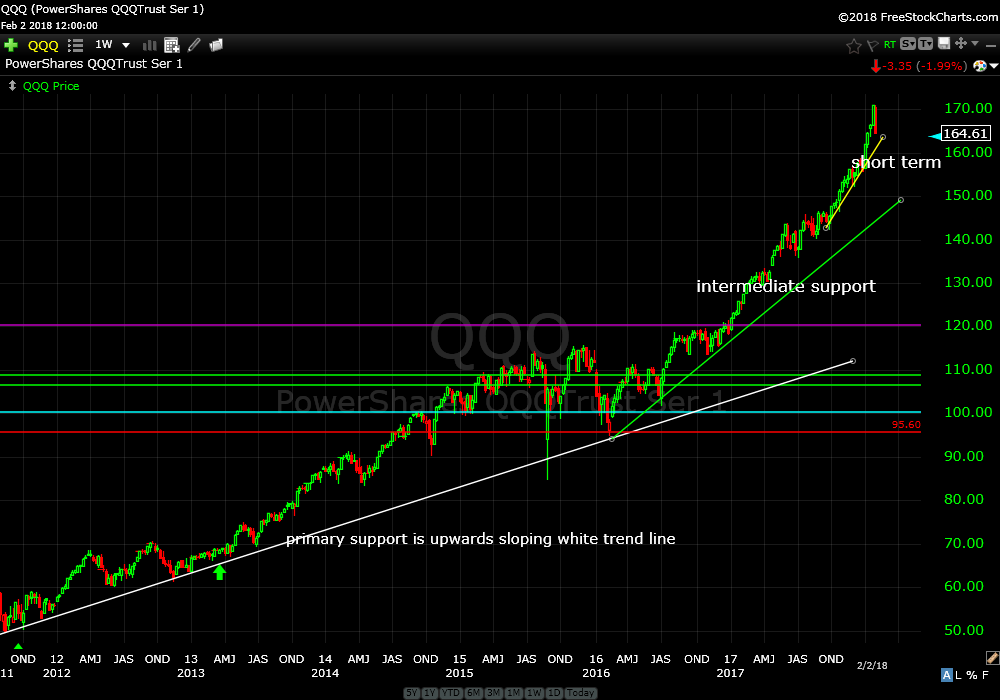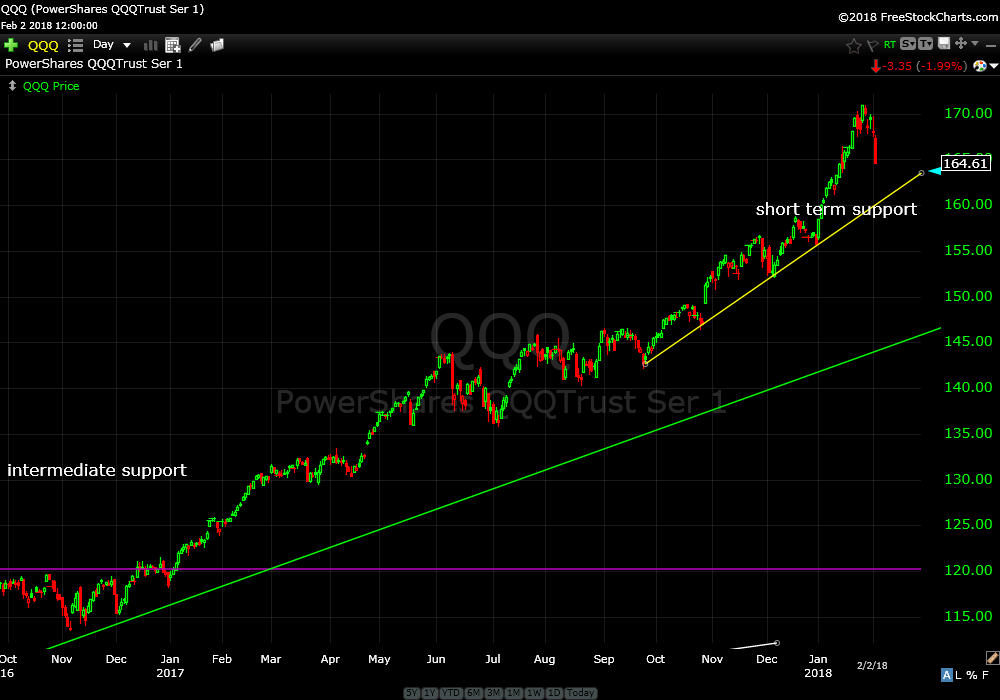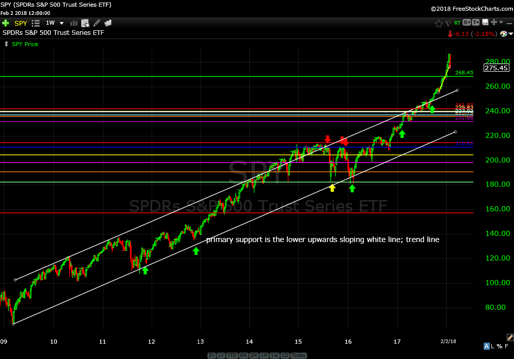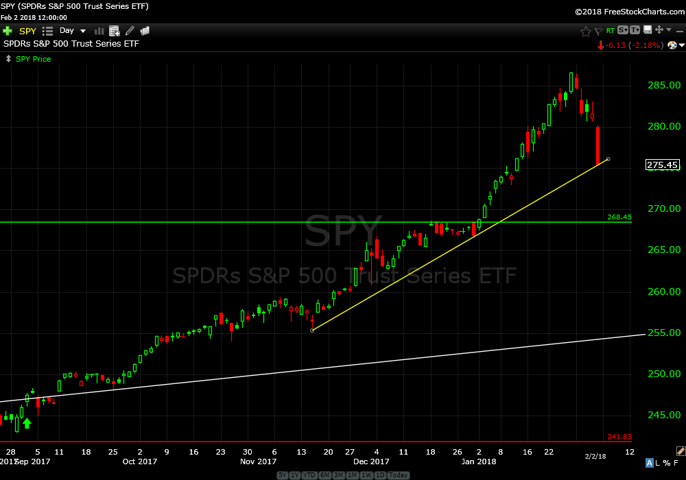 This daily chart, unlike SPY, shows price violated short term support (yellow line) on Friday. The next good support level is $248 which is about 700 Dow points lower.