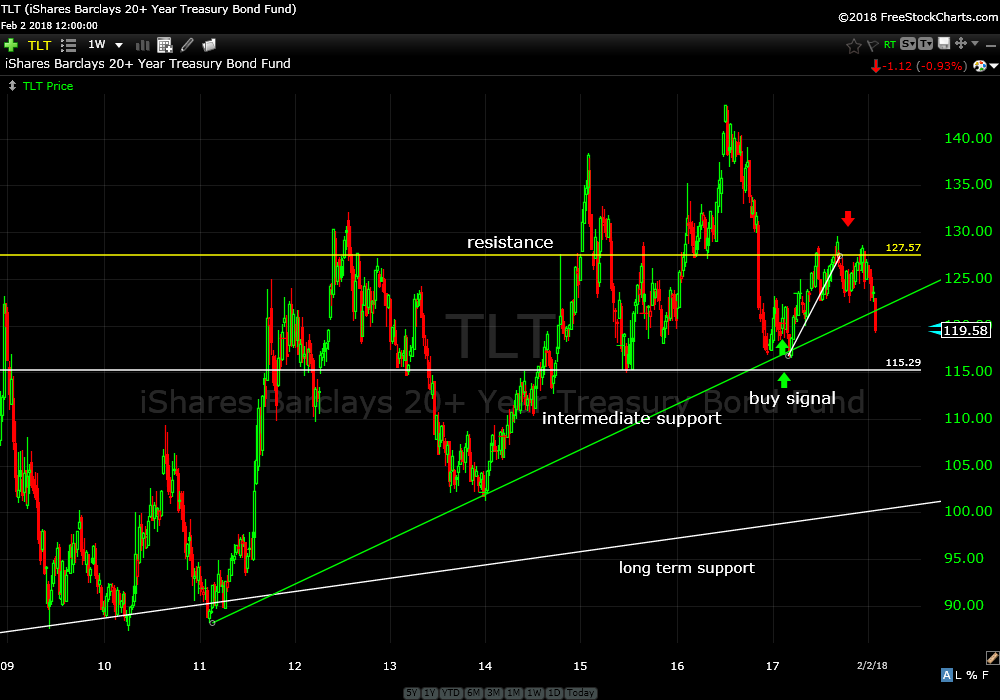 Believe it or not I’m not recommending selling anything yet. I do think there is a bit more pain ahead though. TLT, the ETF iShares Barclays 20+ Year Treasury Bond fund has broken intermediate support, the upwards sloping green line. This might be problematic for equities.