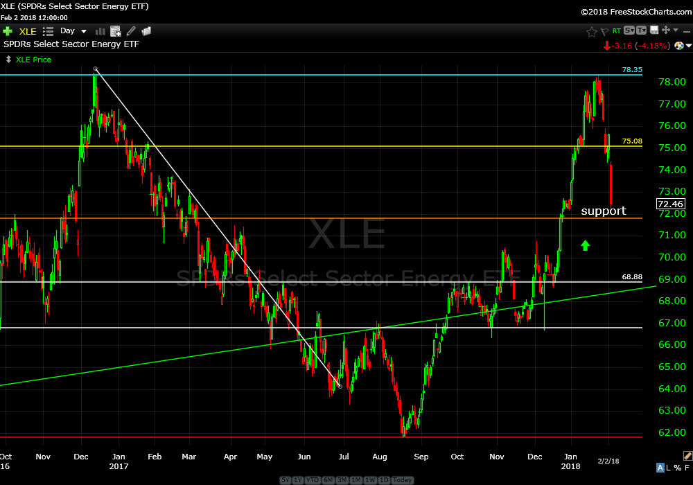 XLE has dropped 7% almost into support (orange line) this past week. Could this be a buying opportunity? We should know fairly soon.
