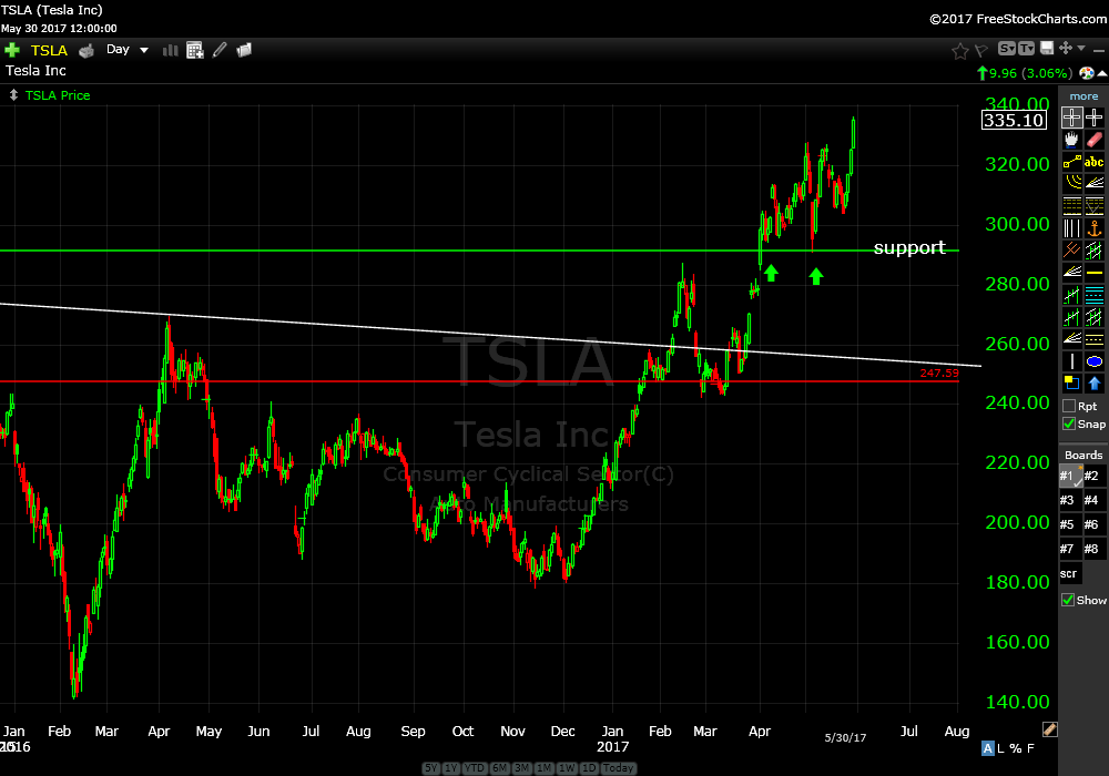 Our recommendations from April 4th and May 8th are up about 12% and 10% respectively. TSLA has ripped higher like a slot car on steroids during the past four trading sessions.