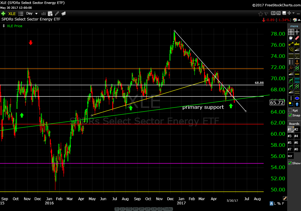 Our recommendation from May 8th is off about 3% and has closed today under primary support; the green upwards sloping trend line. We are not going to live with this too long if price stays under this level of support.