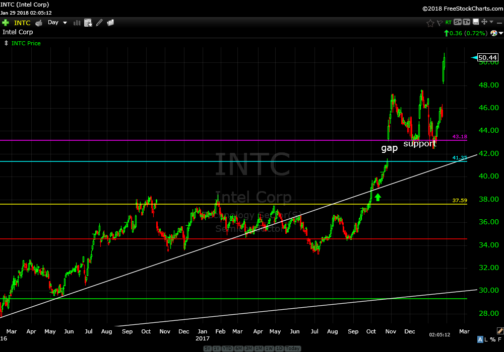 I recommended Intel Corp (INTC) on October 9 of last year. Price has recently ripped up through the 1999/2000 price zone (previous resistance) I wrote about a couple of weeks ago. As of today, Monday, January 29 2018, price is up 27% from my recommendation. Continue to hold.
