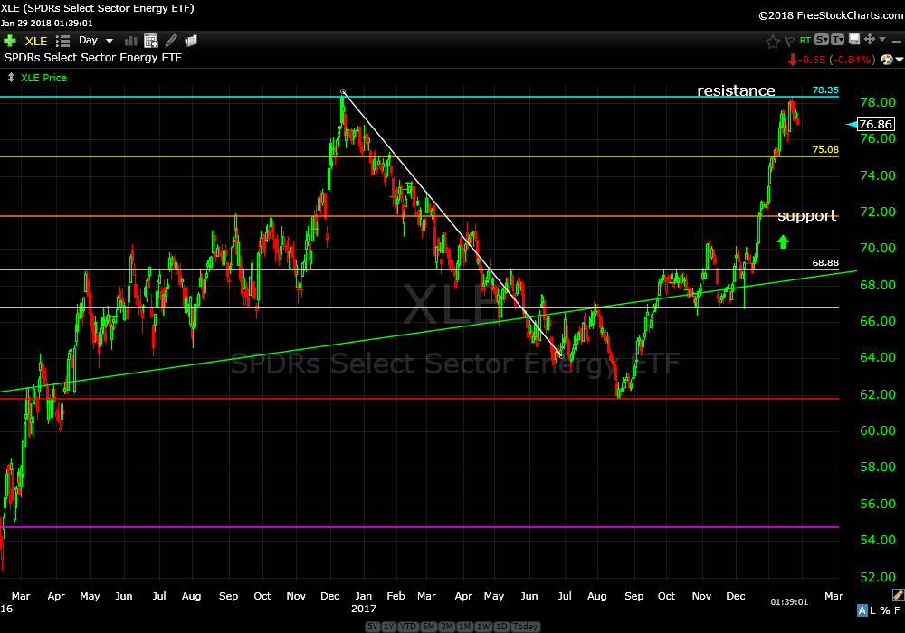 XLE, the energy ETF I recommended on January 8, is still profitable but has hit the resistance I wrote about last week and is fading back a bit. This is not surprising. We need to let this play out a few more days to see if resistance can get taken out. Continue to hold.