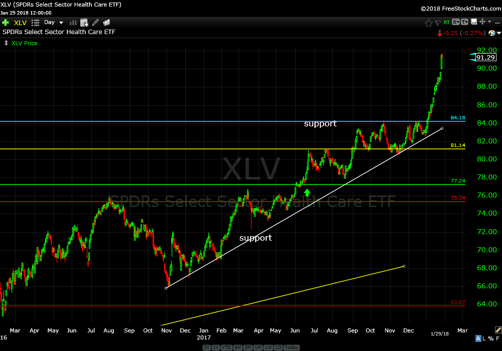 I recommended XLV, the SPDR’s Select Sector Health Care ETF on June 21 last year. Price is up about 15% since. You can see the bullish breakout above the 2017 highs on the daily chart. Continue to hold.