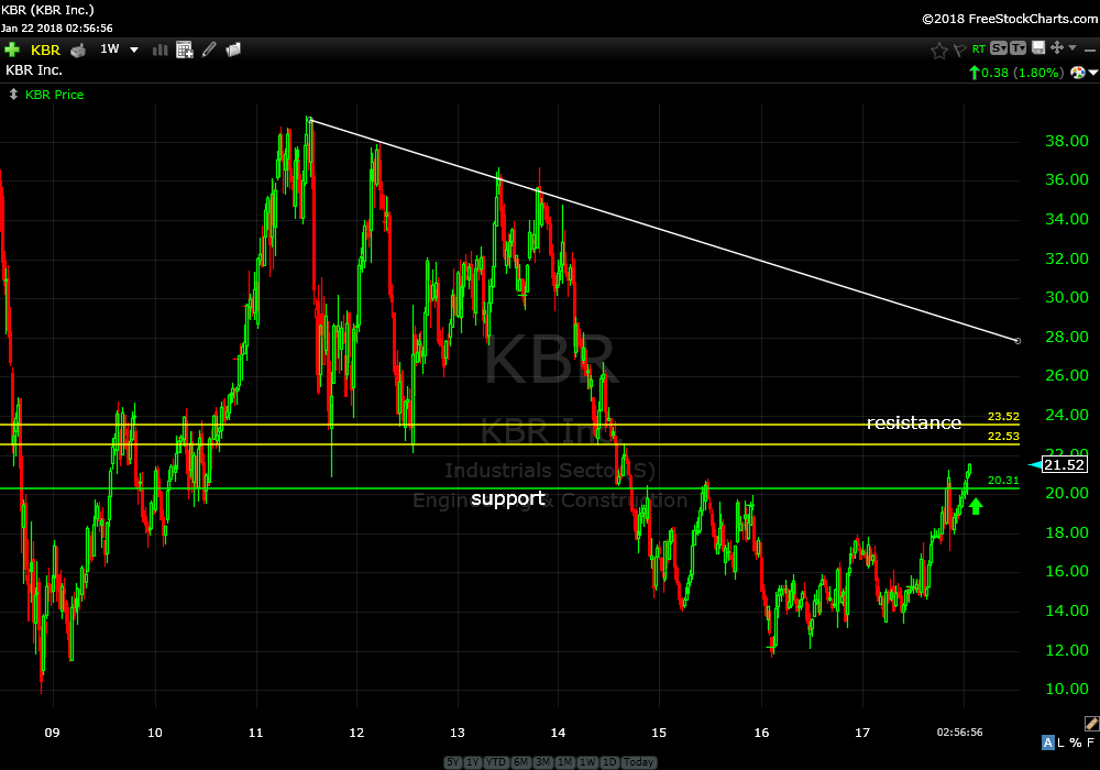 Price just cleared resistance (green horizontal line) which is now support and is approaching higher resistance (two yellow lines). A good three year base from 2015 through 2017 should provide a good foundation to continue higher. Next hurdle is clearing $24. I’m rating this a buy.