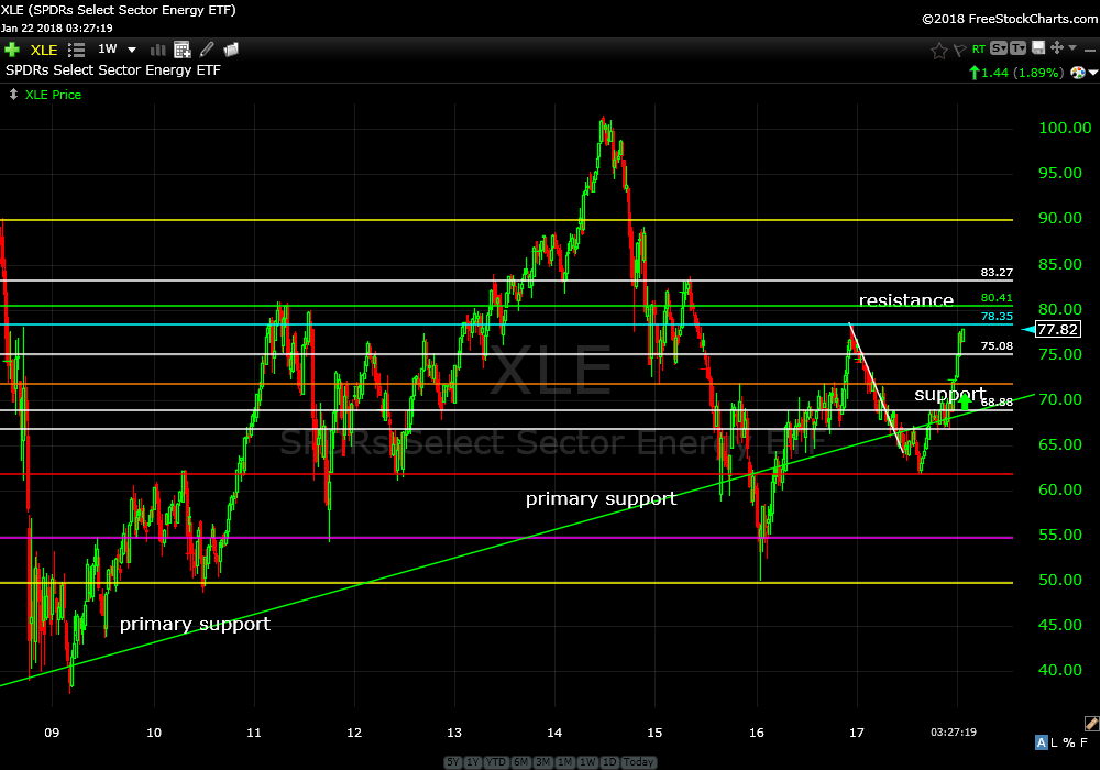 My recent XLE recommendation is up about 4%. Looking at the weekly chart you can see price is approaching resistance, the area bracketed by the blue and green horizontal lines. This price zone is important for the entire energy sector. If price can clear this zone the next hurdle is $83.