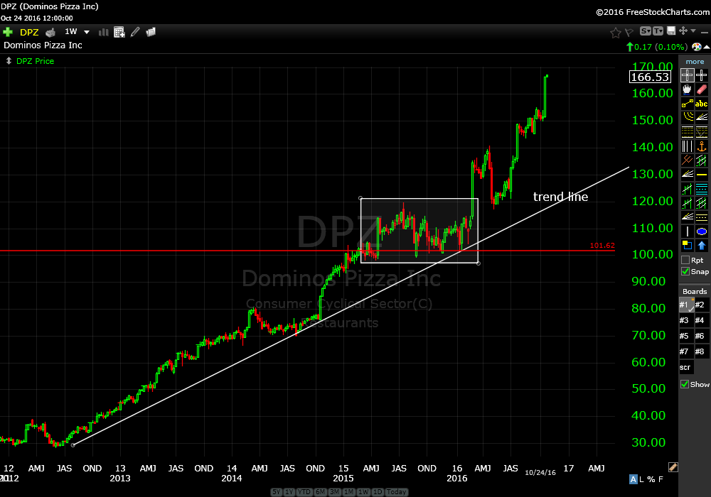 Let’s take a look at what constitutes a good entry point. To give you an idea of how this trade should look moving forward take a look at Dominos Pizza Inc, DPZ.