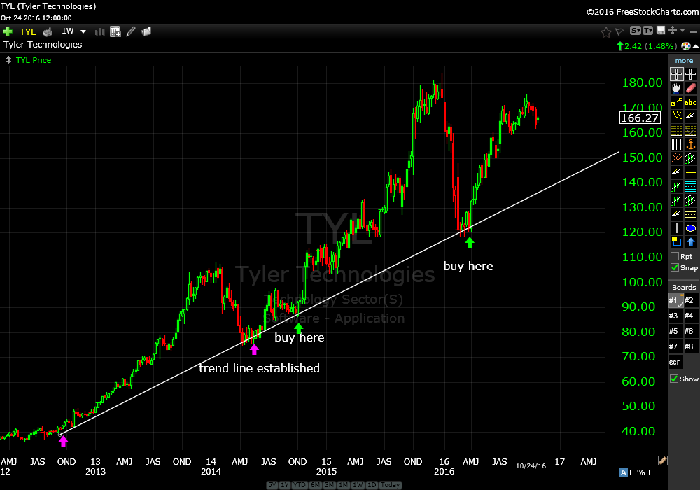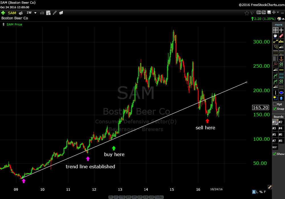 You can always adjust your risk tolerance by creating shorter term trend lines, which would have had you exit nearer the top in the SAM example above.