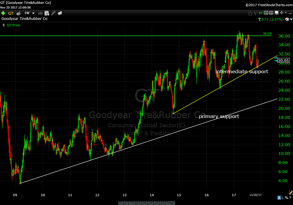 One of my subscribers asked about Goodyear Tire&Rubber Co (GT) a couple of months ago. I recommended waiting for price to fade back into intermediate support.