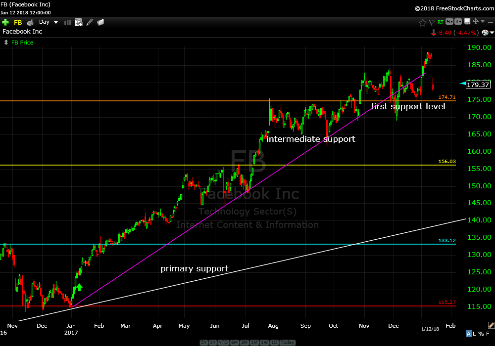 Looking at the daily chart you can see price went down 4.47% on Friday and broke down through intermediate support, the upwards sloping purple line. No worries yet. Price should get support at current “first support level”, the orange horizontal line. Continue to hold.