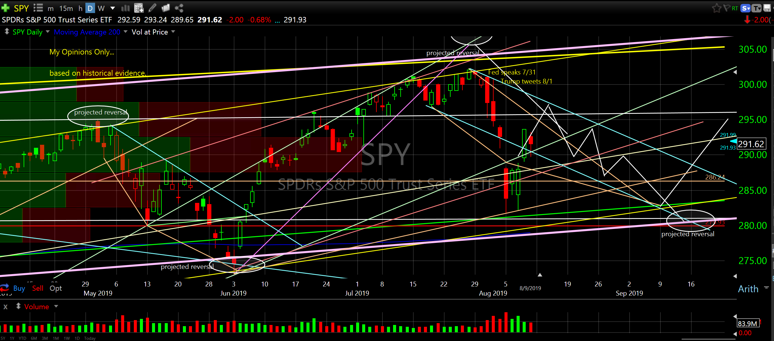 For those of you that want to trade this slide look for price to fail at top of blue line descending channel until reversal higher in September. For those of you that want to de-risk I would expect price to get near SPY 295 next week before reversing lower again and bottoming around SPY280.