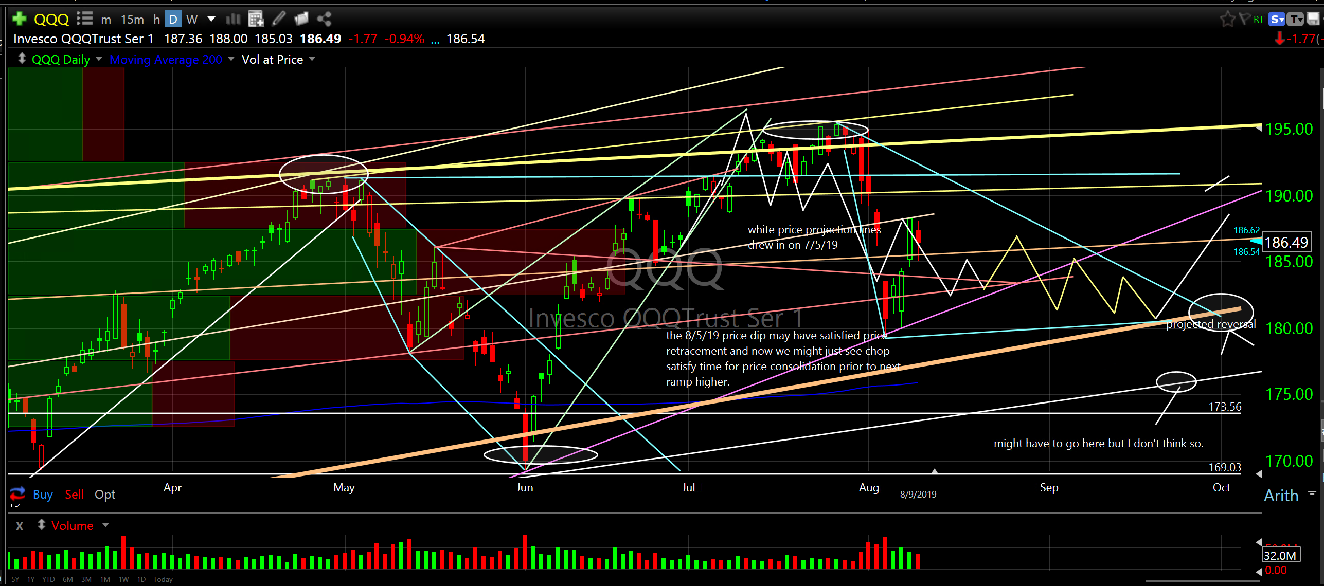 Well, that was a crazy week. The broader market went pretty deep on Monday, to say the least. We went so deep that may have satisfied price retracement and now we just have to eat up some time before ramping higher. It looks like SPY could follow my price projection so possibly a bit higher from here and then more downside before a reversal higher in September.