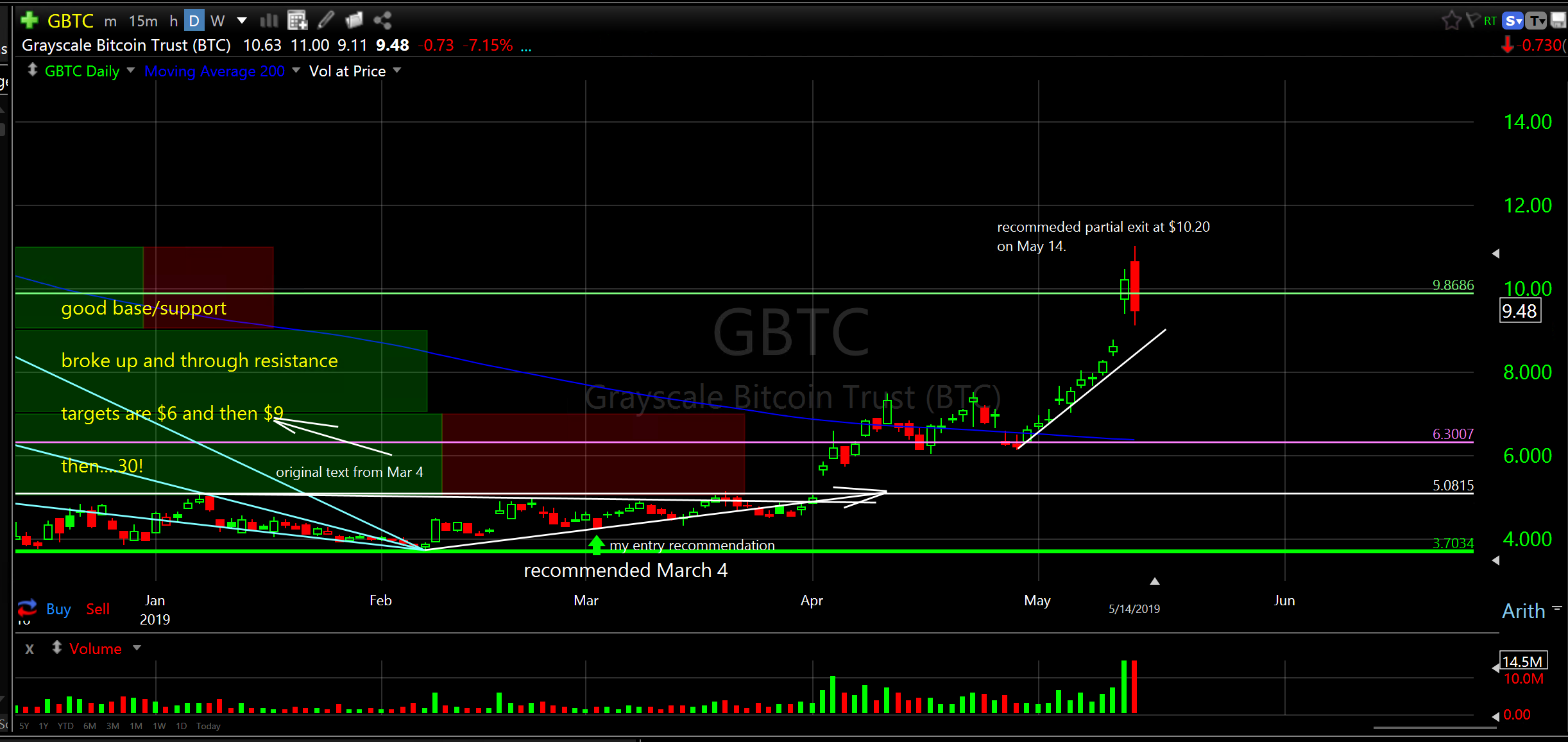 Congrats to those who dismissed the fear and bought GBTC. More than a double so far with partial profits today. I want to keep a position for tagging all time highs but may trade it down and trade it up. See GBTC chart below.