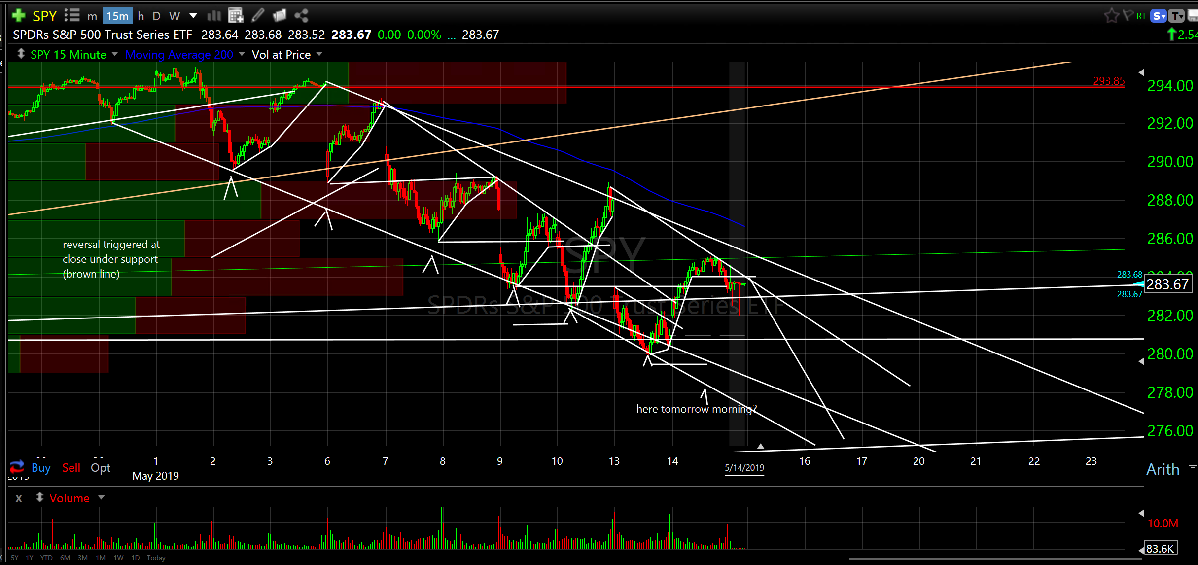 Also, see 15 min chart of SPY. Going deeper (SPY 270ish) if it can’t bust up through higher resistance sooner. Longer term still looks great out to late 2020 though.